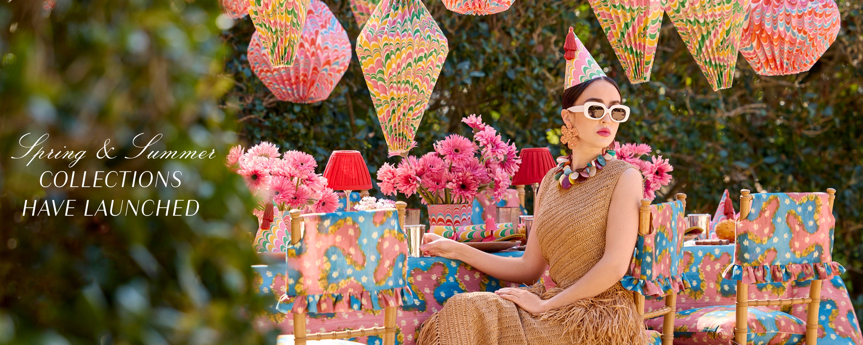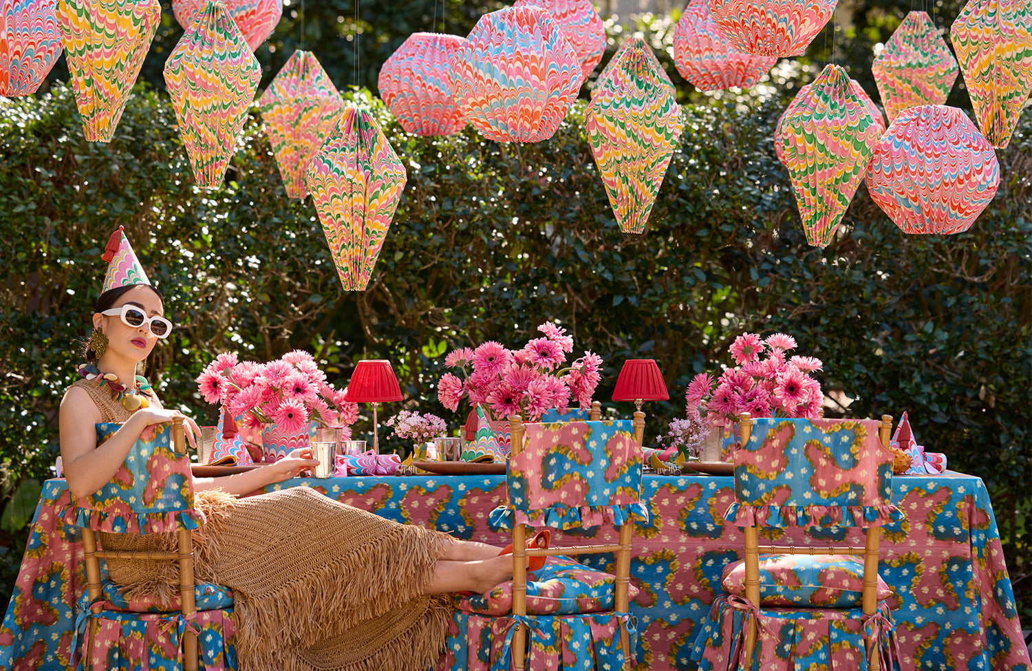 Join us to ballyhoo bikini weather. Nippon linens await summer guests beneath a sea of swaying marbled lanterns. Lose your marbles with matching artisan marbled lanterns, party hats, cachepots, and party crackers.