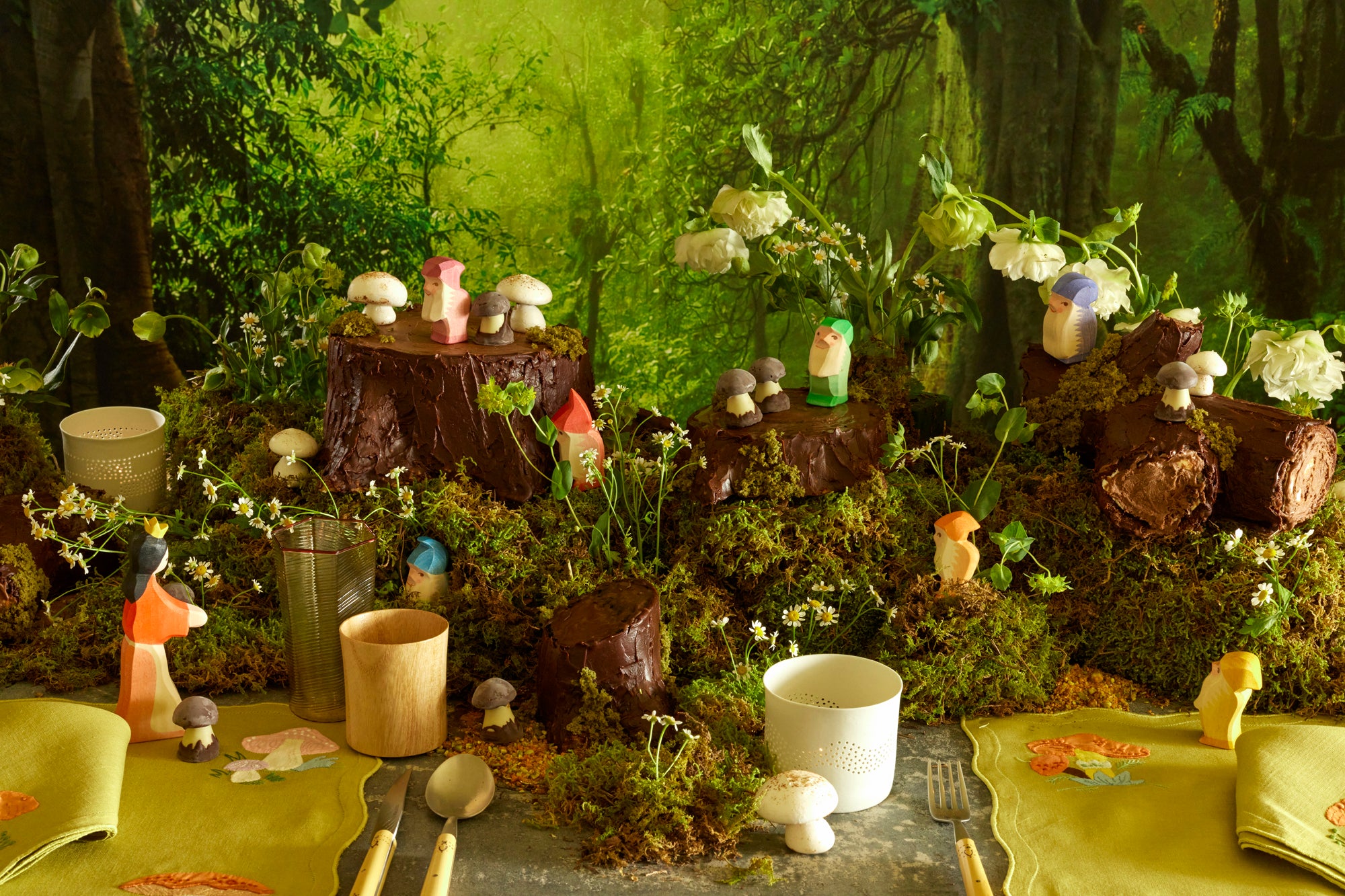 Heigh-ho! On to your Bûche De Noël you go with this magical forest holiday collection. Pair mushroom magic French stitch appliqué placemats and napkins with beautifully crafted wooden figures from Denmark, porcelain votives, and caramel mushrooms.